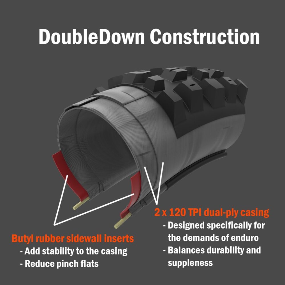 Oblíbený zadní MTB plášť Minion DHR II vhodný na Downhill i Freeride disponuje kompleně novým dezén. Boční výstupky jsou stavěny stejně jako u známého Minionu DHF, ale jsou inovovány a upraveny pro zadní plášť. Centrální dezén má množství hran a zešikmení pro efektivní odvalování a pro maximální brzdný výkon. Výsledkem inovace je výšší akcelerace, vyšší podpora při zatáčení a samožřejmě již zmíněný brzdný výkon. Plášť je dostupný ve směsi 3C Maxx Grip, která je ideální do měkkého a vlhkého podkladu. Nabízí nízký valivý odpor, slušnou životnost a dobrou přilnavost. Nechybí zde ani Double Down výztuha pro vyšší odolnost a možnost použít plášť jako bezdušový.